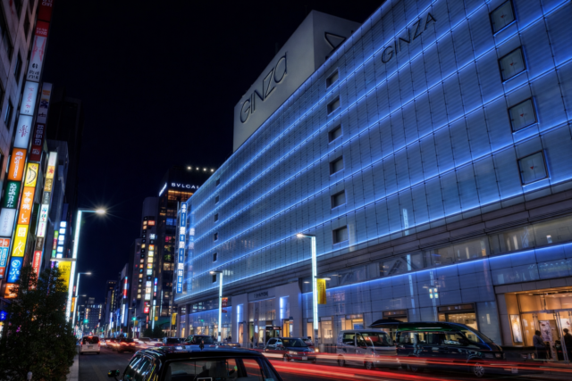 東京・銀座。夜になると、整然と並ぶビル群がやわらかく光に包まれます。 ネオン、ショーウィンドウ、ブラ